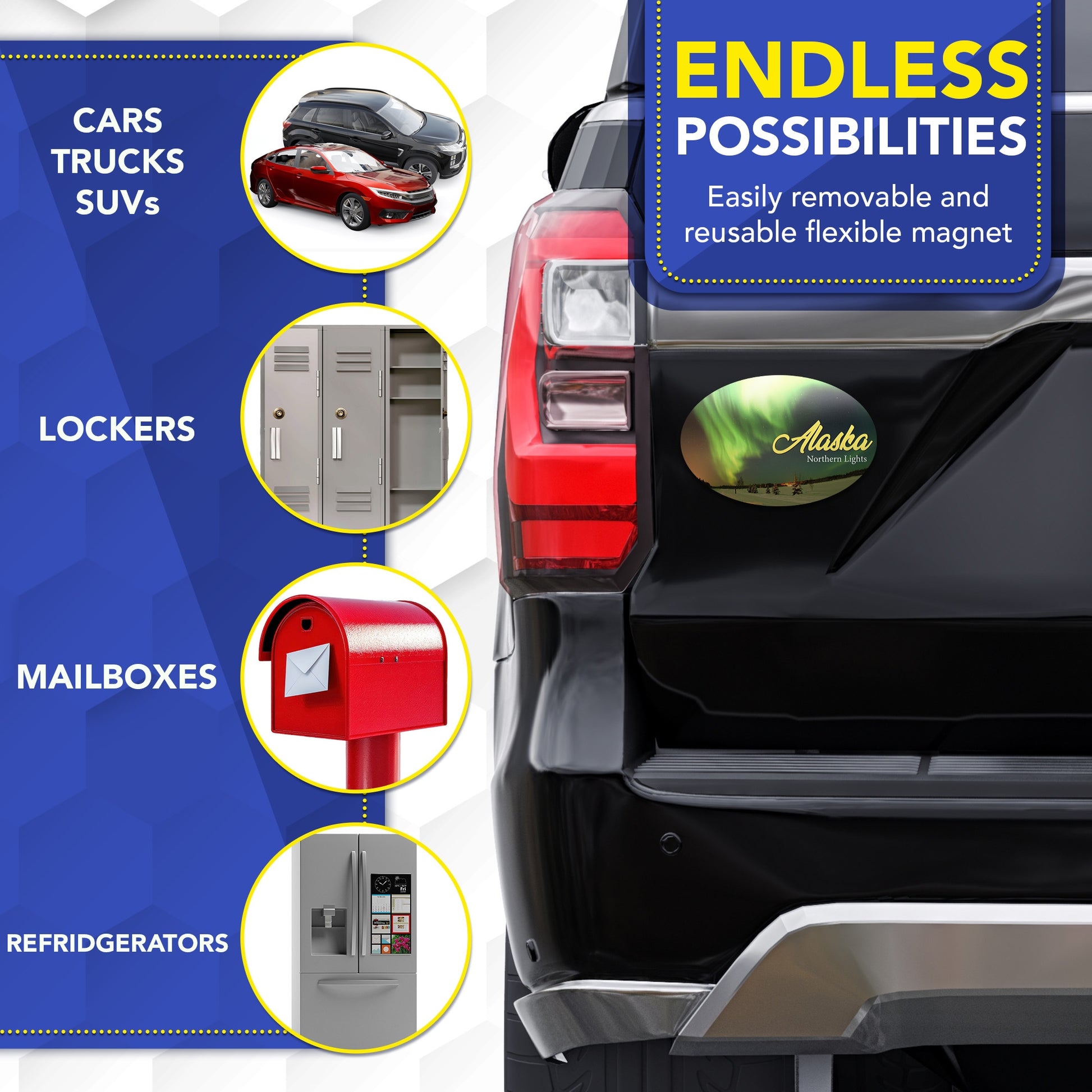 - ๐งฒ ๐๐ป๐ฑ๐น๐ฒ๐๐ ๐ฝ๐ผ๐๐๐ถ๐ฏ๐ถ๐น๐ถ๐๐ถ๐ฒ๐; our heavy-duty magnets are ideal for use on cars, trucks, SUVs, mailboxes, refrigerators, toolboxes, etc. Easily removable and reusable, you can proudly display this flexible magnet in a plethora of spaces. Please ensure that your surface is composed of steel rather than fiberglass, plastic, or aluminum. Magnets will not stick to non-metal surfaces.