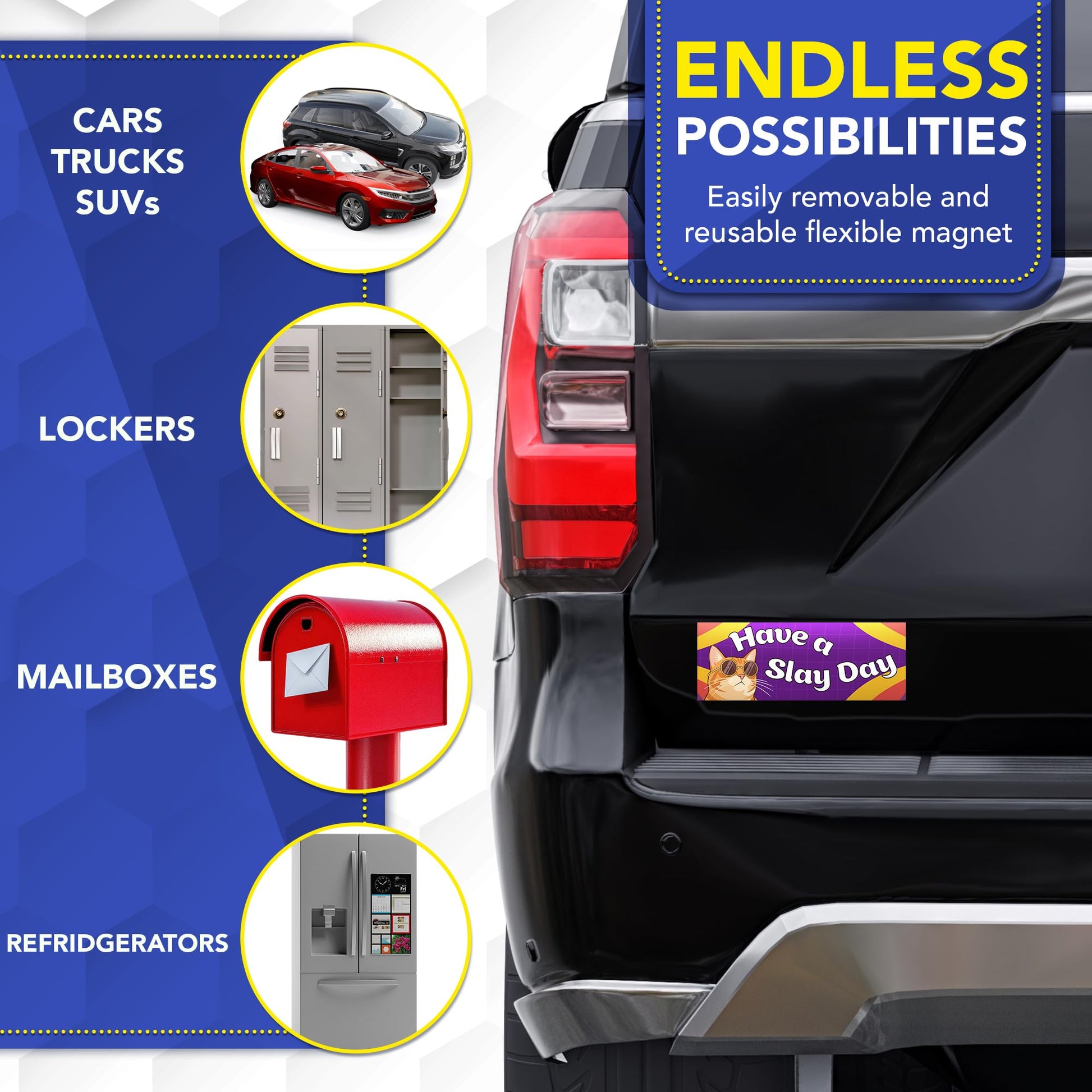 - ๐งฒ ๐๐ป๐ฑ๐น๐ฒ๐๐ ๐ฝ๐ผ๐๐๐ถ๐ฏ๐ถ๐น๐ถ๐๐ถ๐ฒ๐; our heavy-duty magnets are ideal for use on cars, trucks, SUVs, mailboxes, refrigerators, toolboxes, etc. Easily removable and reusable, you can proudly display this flexible magnet in a plethora of spaces. Please ensure that your surface is composed of steel rather than fiberglass, plastic, or aluminum. Magnets will not stick to non-metal surfaces.