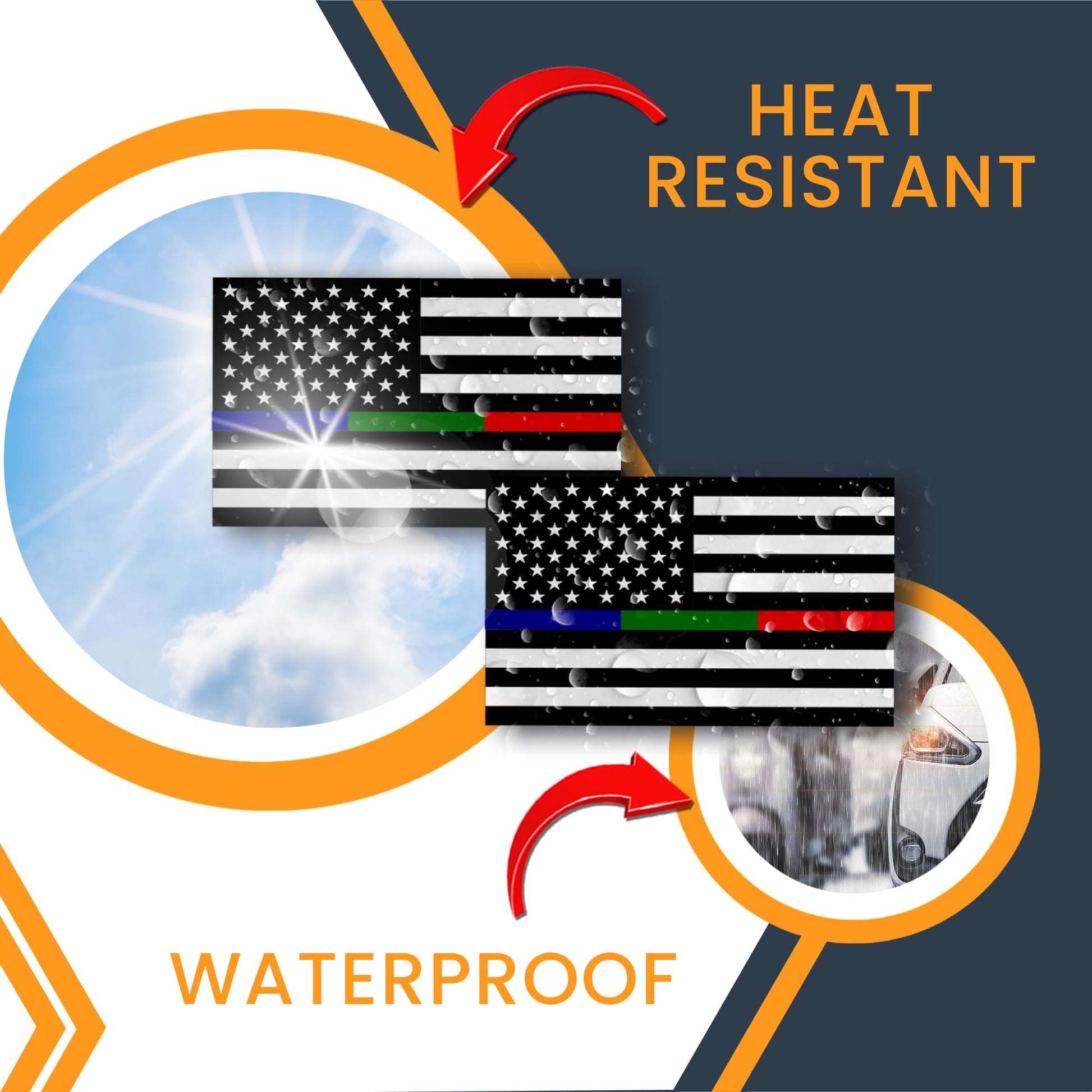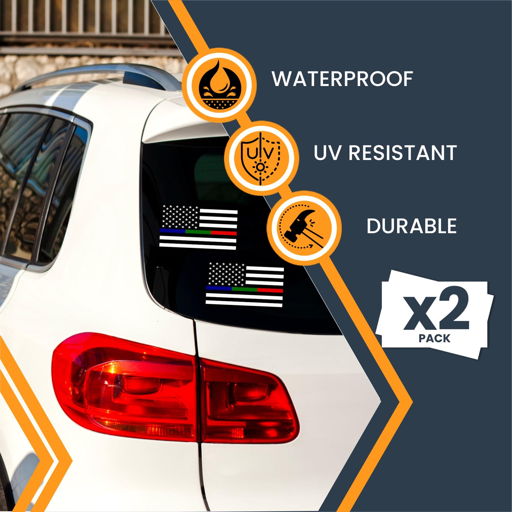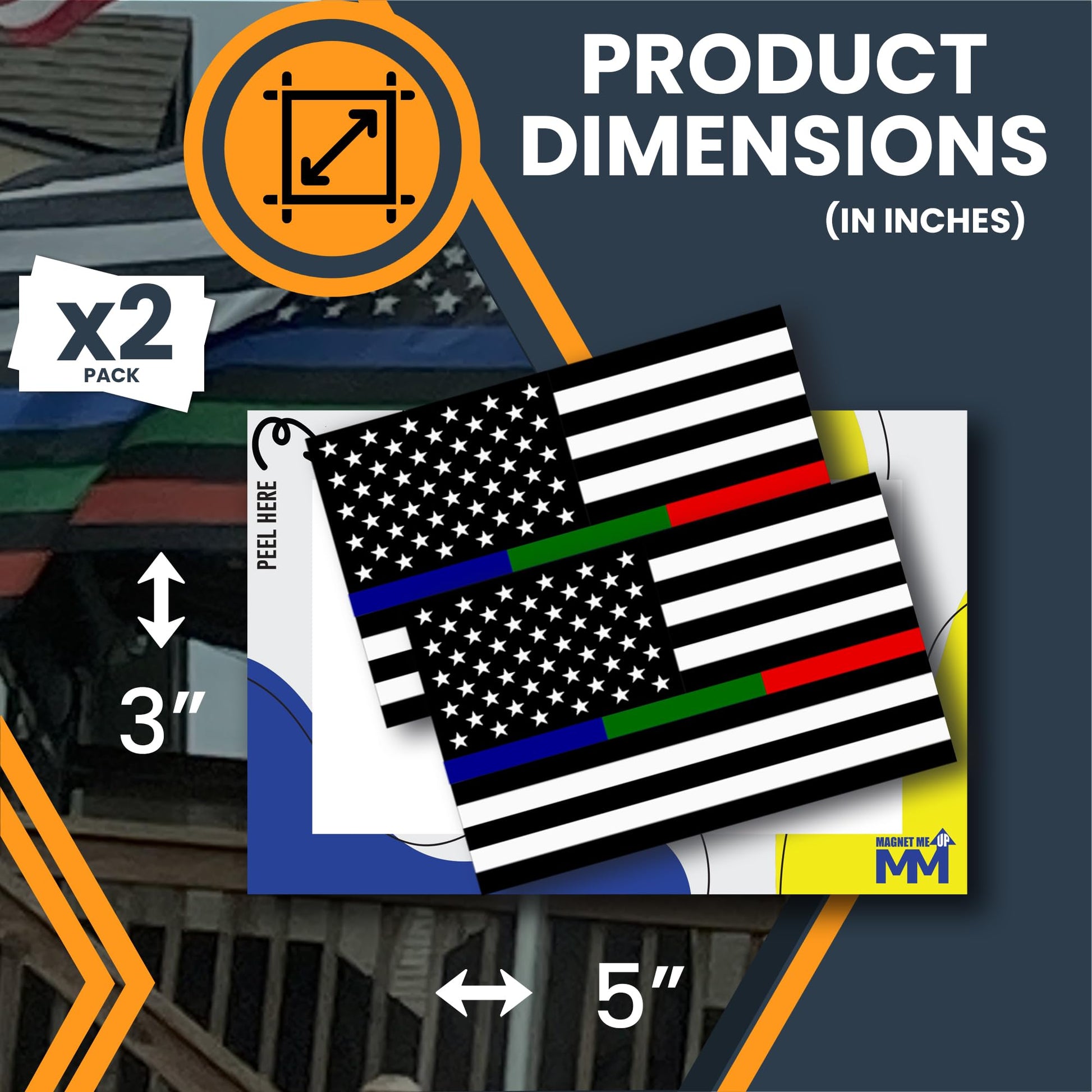 Magnet Me Up Thin Line American Flag Adhesive Decal Sticker, 3x5, 2 Packs, Black, White & Red Blue Green USA Flag for Fire, Police, Military Support, Waterproof, for Vehicles, & More - Made in USA