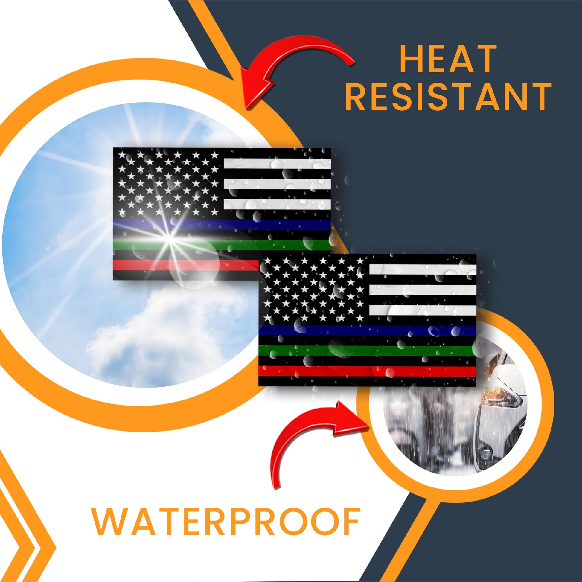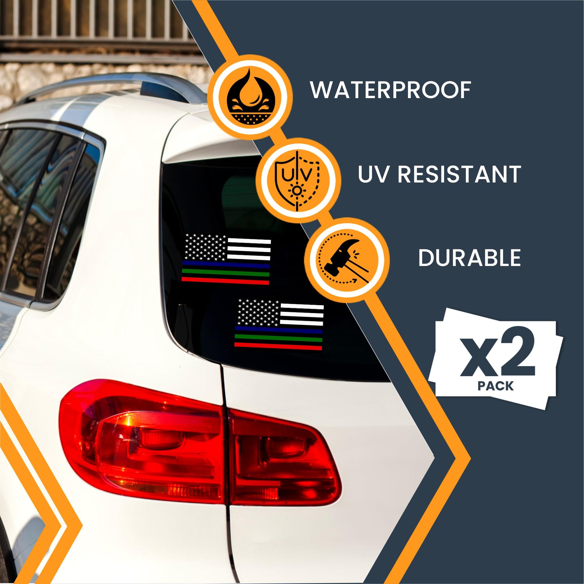 Magnet Me Up Tri-Color Thin Line American Flag Adhesive Decal Sticker, 3x5, 2 Packs, Black, White & Red Blue Green USA Flag for Fire, Police, Military Support, Waterproof, for Vehicles - Made in USA