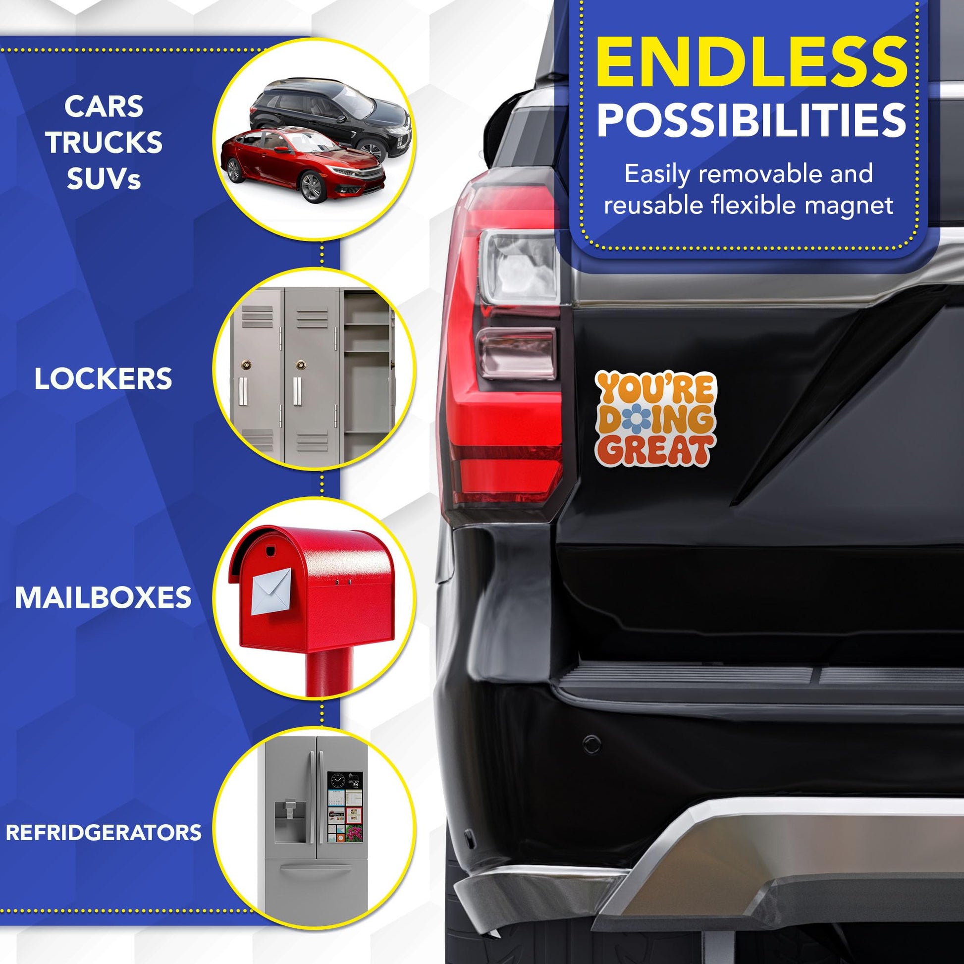 - ๐งฒ ๐๐ป๐ฑ๐น๐ฒ๐๐ ๐ฝ๐ผ๐๐๐ถ๐ฏ๐ถ๐น๐ถ๐๐ถ๐ฒ๐; our heavy-duty magnets are ideal for use on cars, trucks, SUVs, mailboxes, refrigerators, toolboxes, etc. Easily removable and reusable, you can proudly display this flexible magnet in a plethora of spaces. Please ensure that your surface is composed of steel rather than fiberglass, plastic, or aluminum. Magnets will not stick to non-metal surfaces.